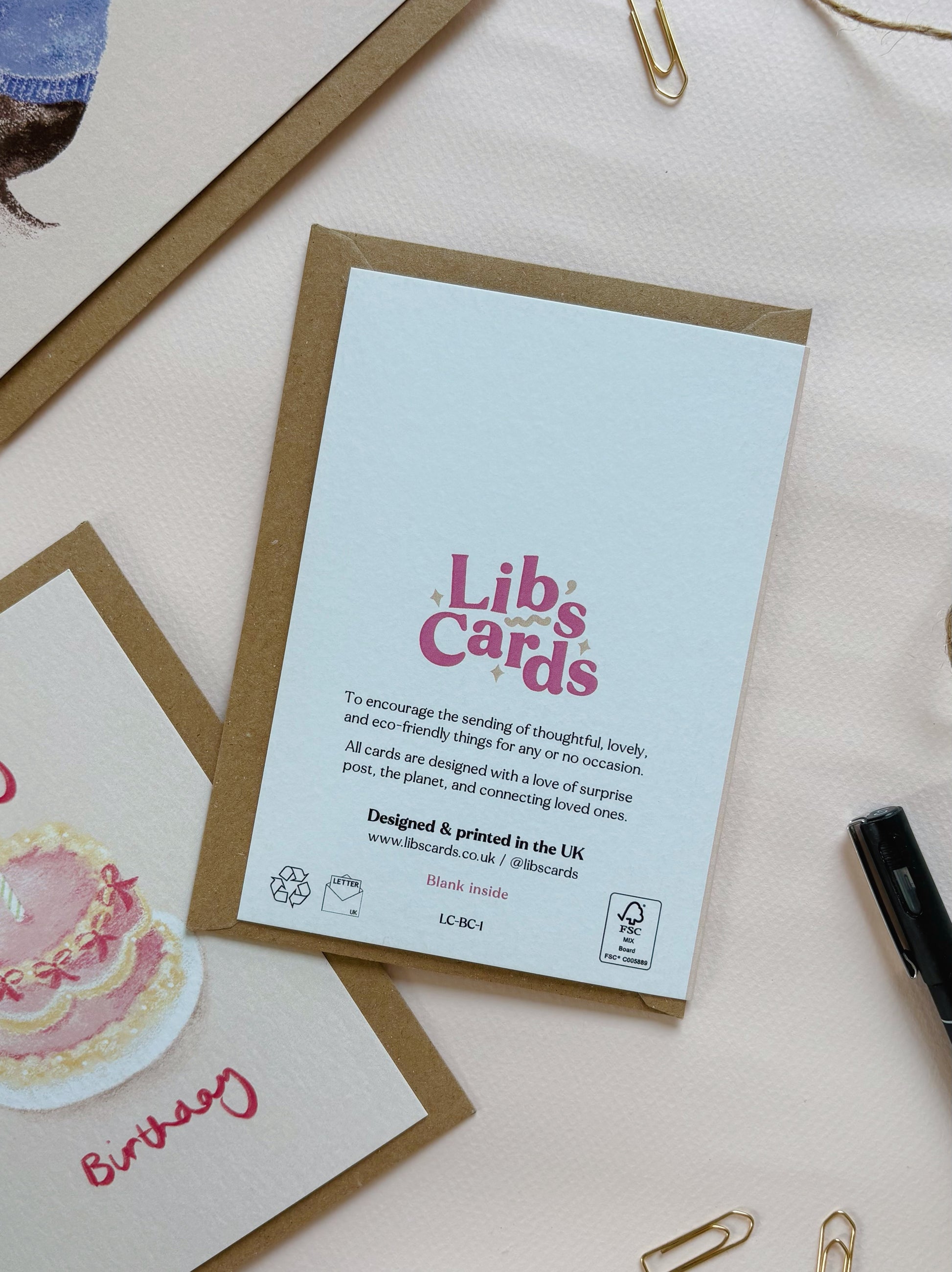 Lib's Cards are drawn digitally by me and made with huge amounts of love. All cards come with a recycled brown envelope and are blank inside.