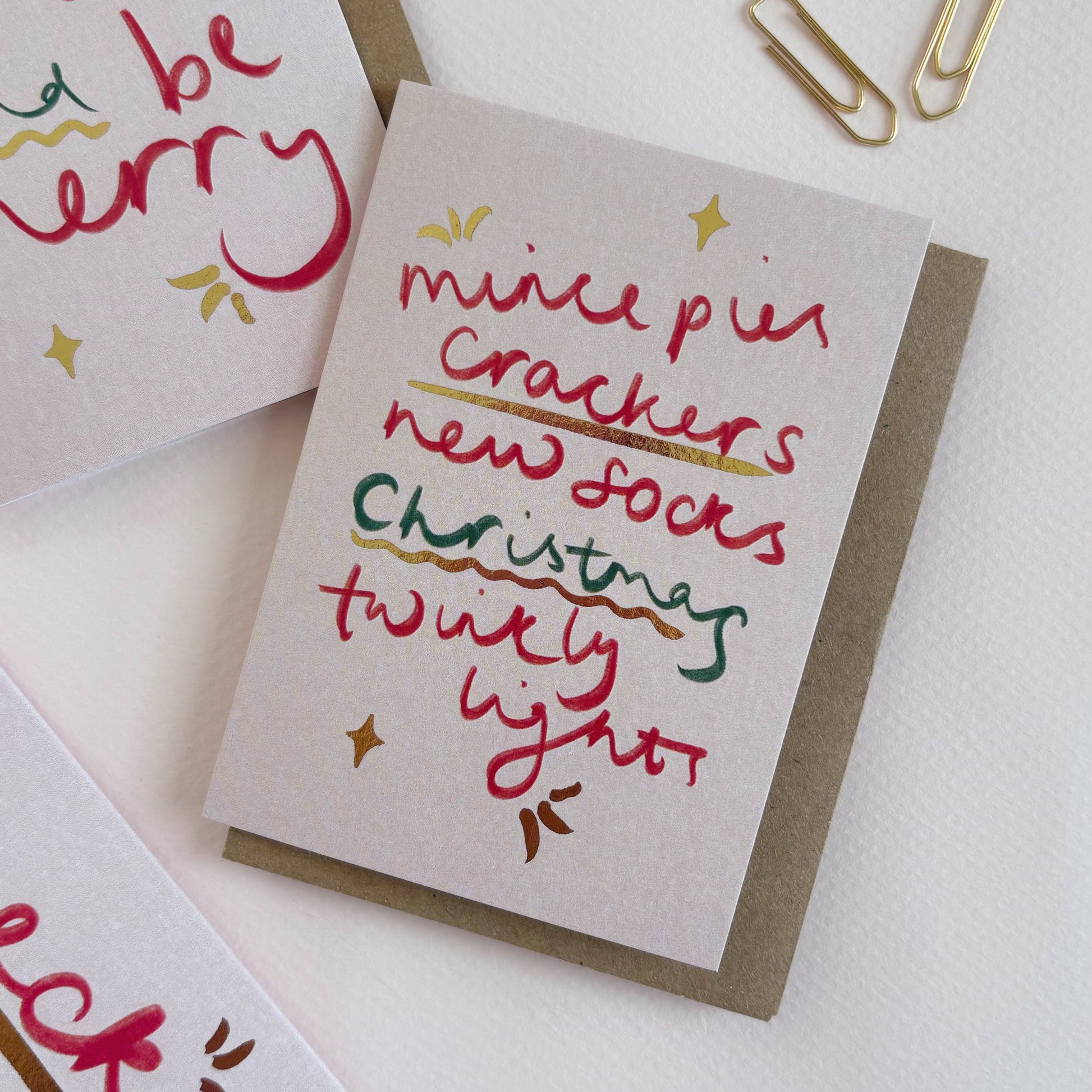 Mince Pies, Crackers is A7 and measures 74mm x 105mm. It's printed onto FSC certified card and printed in Sheffield.