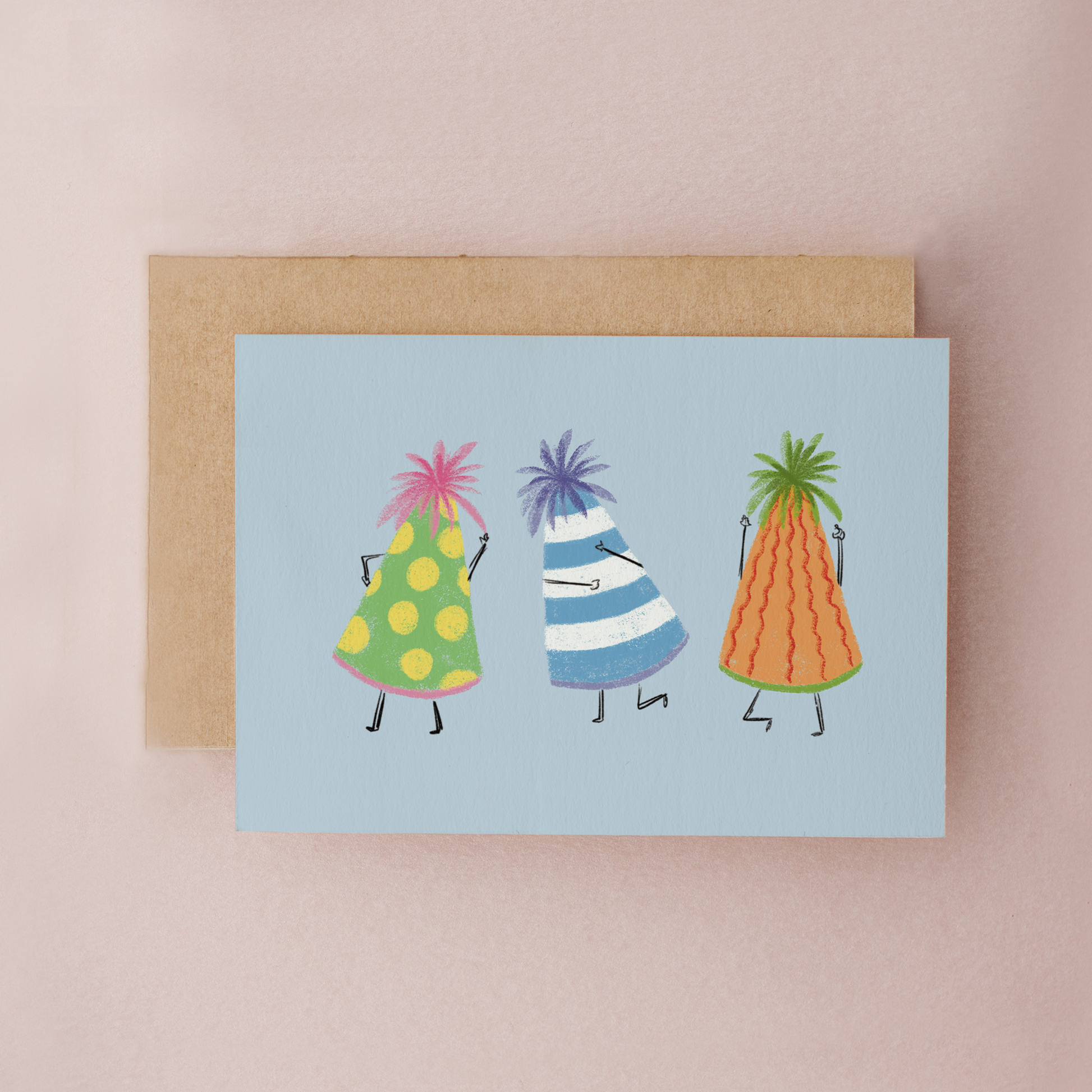 Party Hats is A6 and measures 105mm x 148mm. It's printed onto FSC certified card and printed in Sheffield.