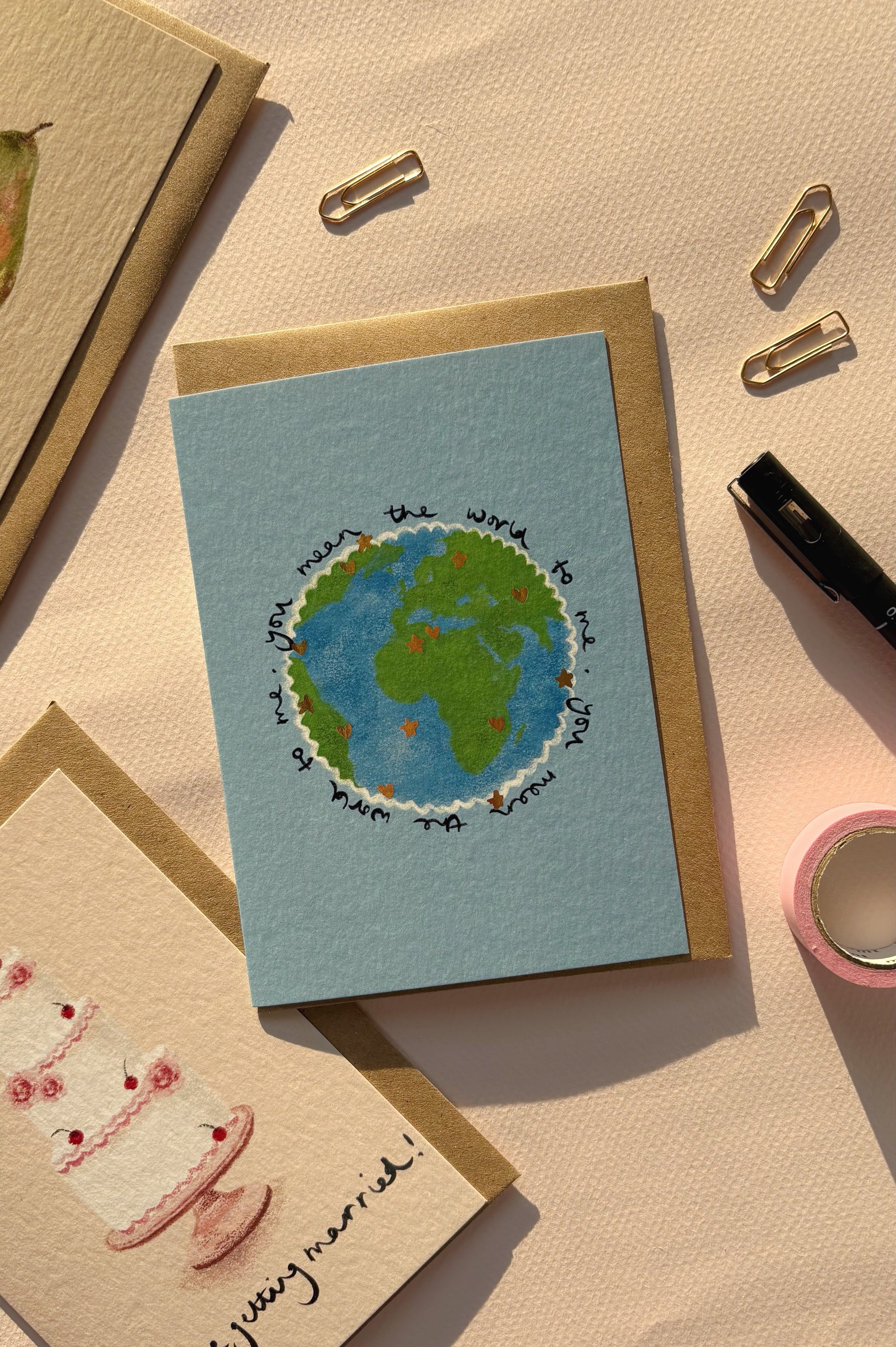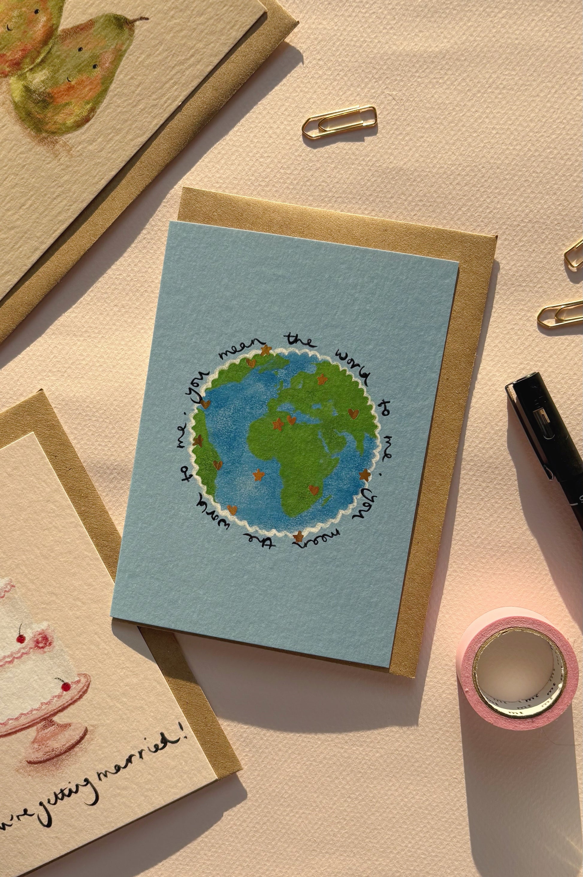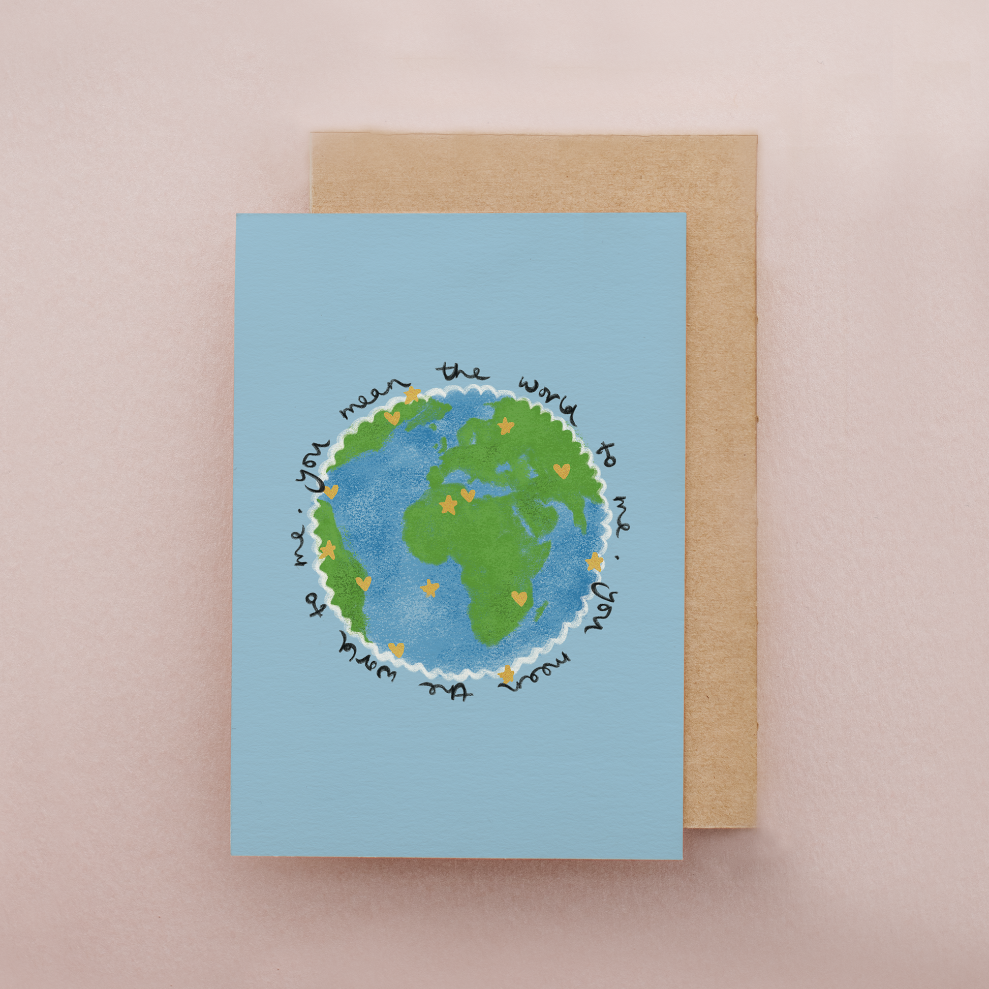A heartfelt message for your loved one any day of the year with the message ‘you mean the world to me’ and complete with gold foiled elements.